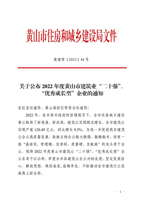 近日,黃山市住房和城鄉(xiāng)建設(shè)局發(fā)布的《2022年度黃山市建筑業(yè)二十強(qiáng)企名單》中,黃山建工集團(tuán)股份有限公司榮獲2022年“黃山市建筑業(yè)企業(yè)二十強(qiáng)”。