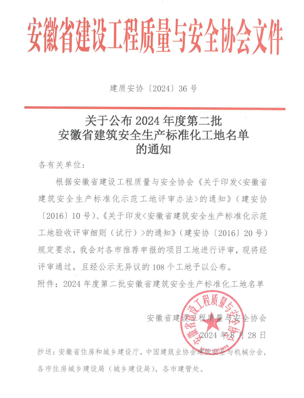 近日,安徽省建設(shè)工程質(zhì)量與安全協(xié)會公布2024年度第二批安徽省建筑安全生產(chǎn)標(biāo)準(zhǔn)化工地名單,由黃山建工集團(tuán)承建的國網(wǎng)安徽黃山供電公司運(yùn)維檢修及信息通信用房項目光榮上榜。