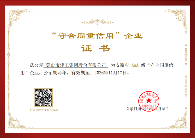 近日,黃山建工集團(tuán)憑借健全的信用管理體系、優(yōu)良的合同履約信用狀況和良好的市場(chǎng)信譽(yù)榮獲安徽省AAA級(jí)“守合同重信用”企業(yè)稱(chēng)號(hào)。這一榮譽(yù)的獲得,不僅是對(duì)黃山建工集團(tuán)在企業(yè)經(jīng)營(yíng)過(guò)程中始終堅(jiān)持誠(chéng)信經(jīng)營(yíng)的肯定,也是對(duì)黃山建工集團(tuán)在合同履行和信用管理方面所取得的顯著成績(jī)的認(rèn)可。