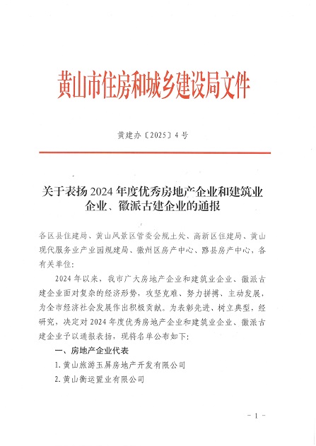 近日,黃山市住房和城鄉(xiāng)建設(shè)局發(fā)布了《關(guān)于表揚2024年度優(yōu)秀房地產(chǎn)企業(yè)和建筑業(yè)企業(yè)、徽派古建企業(yè)的通報》,黃山建工集團榮獲2024年度優(yōu)秀建筑業(yè)企業(yè)稱號。