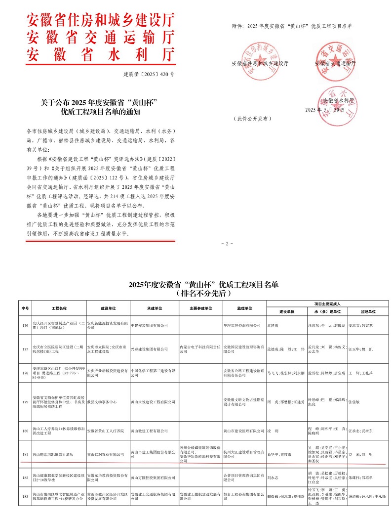 近日,安徽省住房和城鄉(xiāng)建設(shè)廳、安徽省交通運輸廳、安徽省水利廳聯(lián)合公布了2025年度省“黃山杯”優(yōu)質(zhì)工程項目名單,黃山市建工集團(tuán)承建的黃山橫江灣凱悅嘉軒酒店項目成功入選,榮膺安徽省建設(shè)工程質(zhì)量最高榮譽(yù)——“黃山杯”獎。